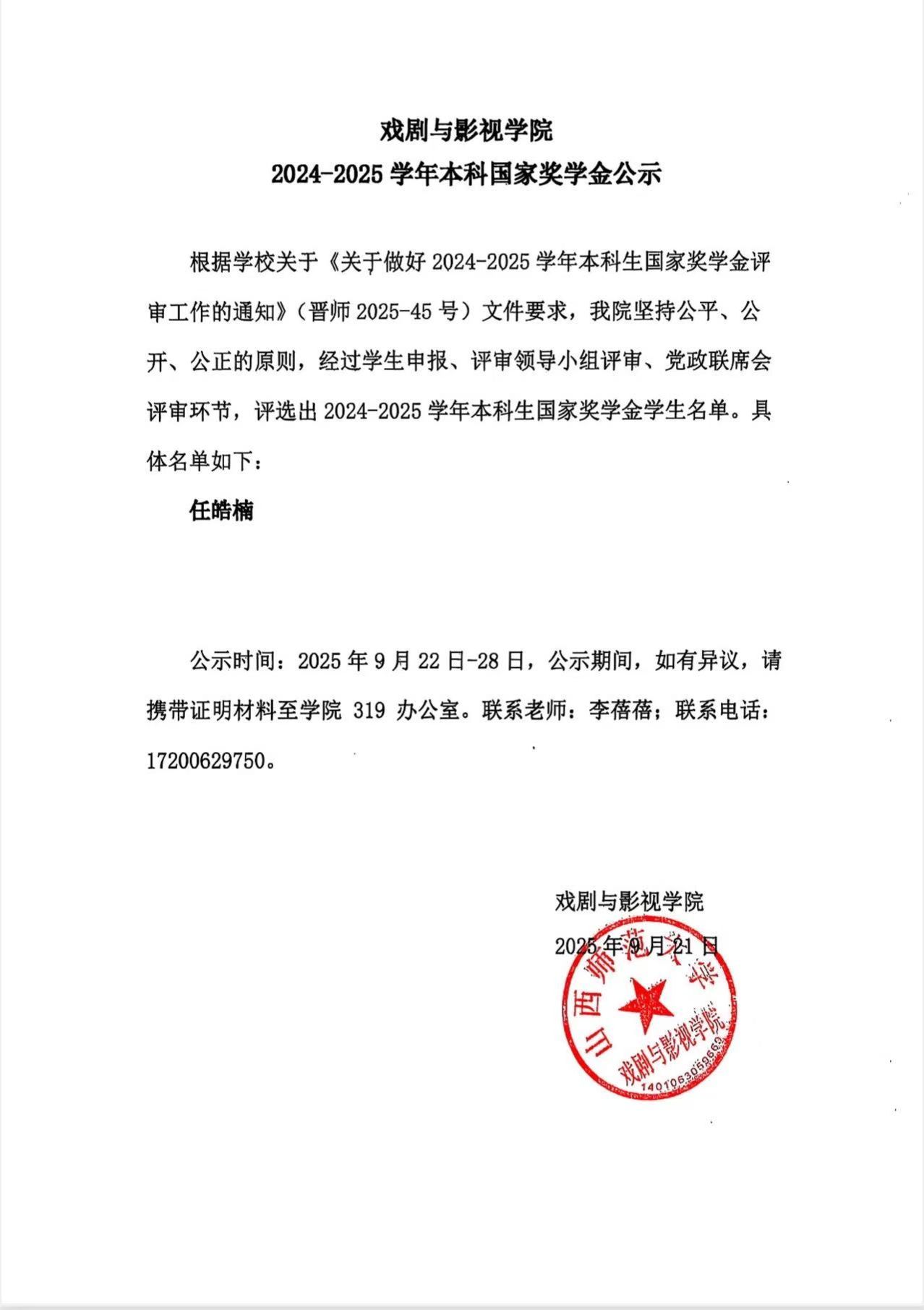 太阳成集团tyc151cc2024-2025学年本科国家奖学金公示