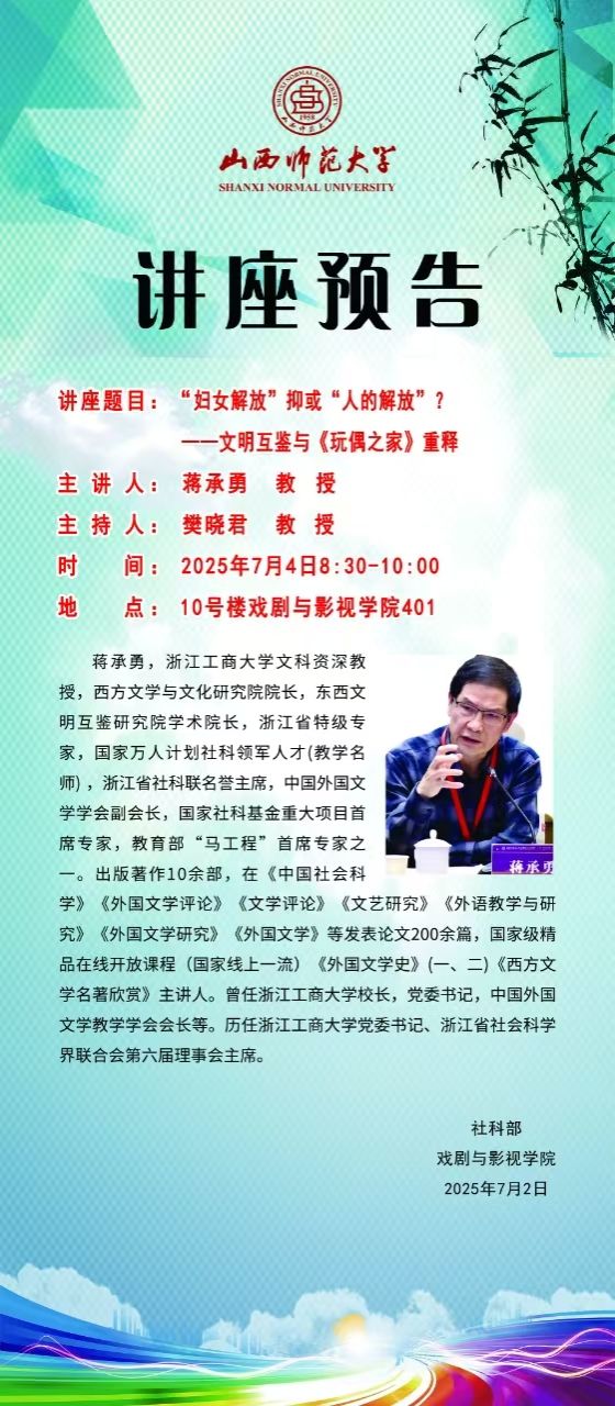 ?——文明互鉴与〈玩偶之家〉重释》讲座,主讲人为蒋承勇教授,本次讲座由樊晓君教授主持。