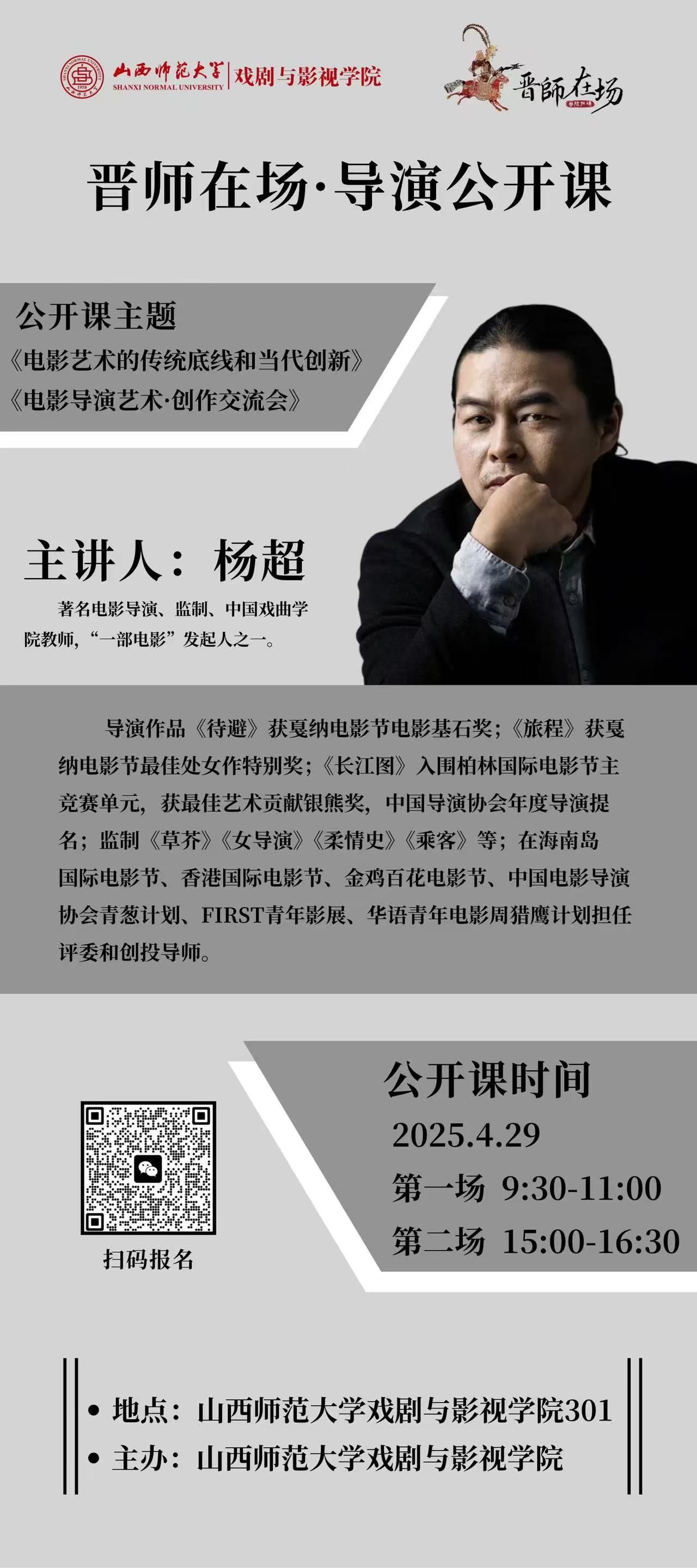 我集团拟4月29日(周二)09:30-11:00和15:00-16:30两个时间段在南区10号楼401会议室举办《电影艺术的传统底线和当代创新》和《电影导演艺术·创作交流会》讲座,主讲人为杨超导演。