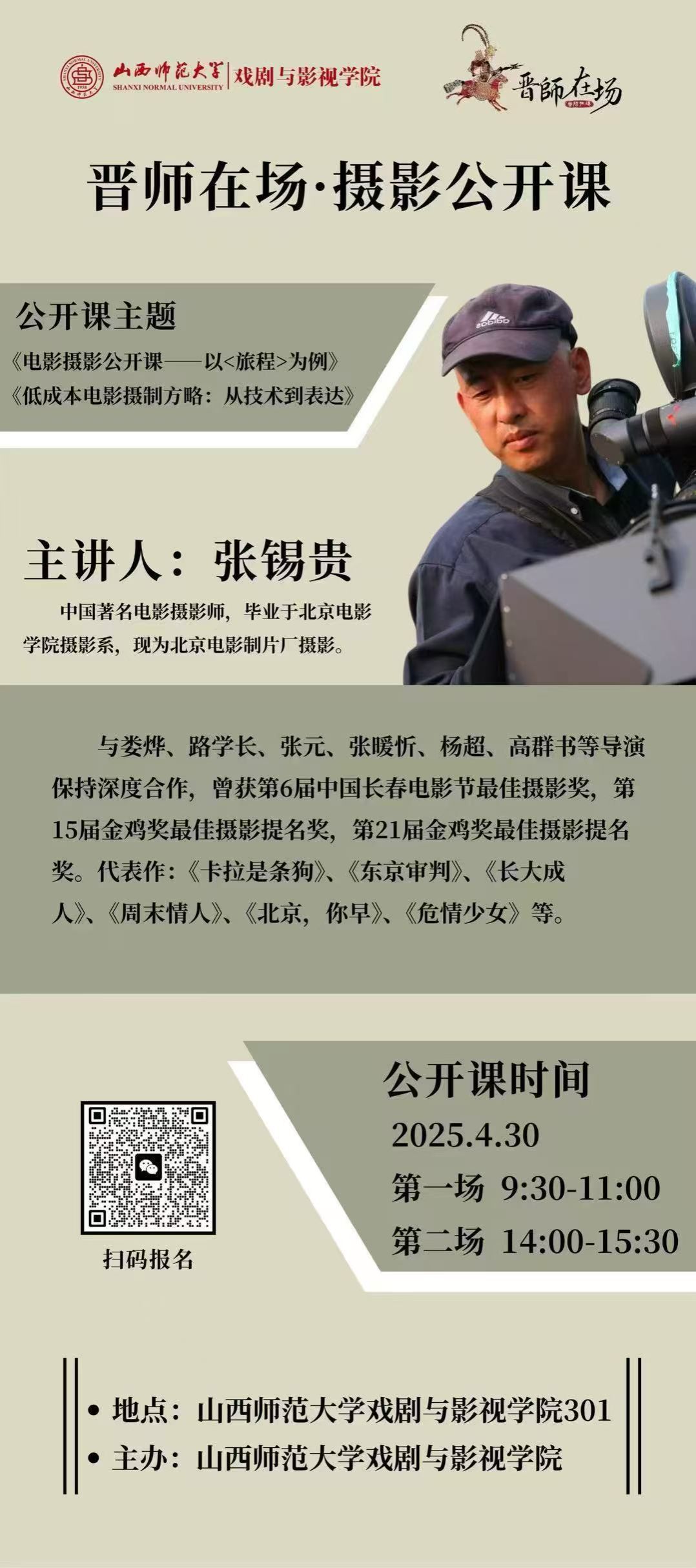 我集团拟4月30日(周三)09:30-11:00和14:00-15:30两个时间段在南区10号楼301会议室举办《电影摄影公开课-以<旅程>为例》和《低成本电影摄制方略:从技术到表达》讲座,主讲人为张锡贵摄影师。