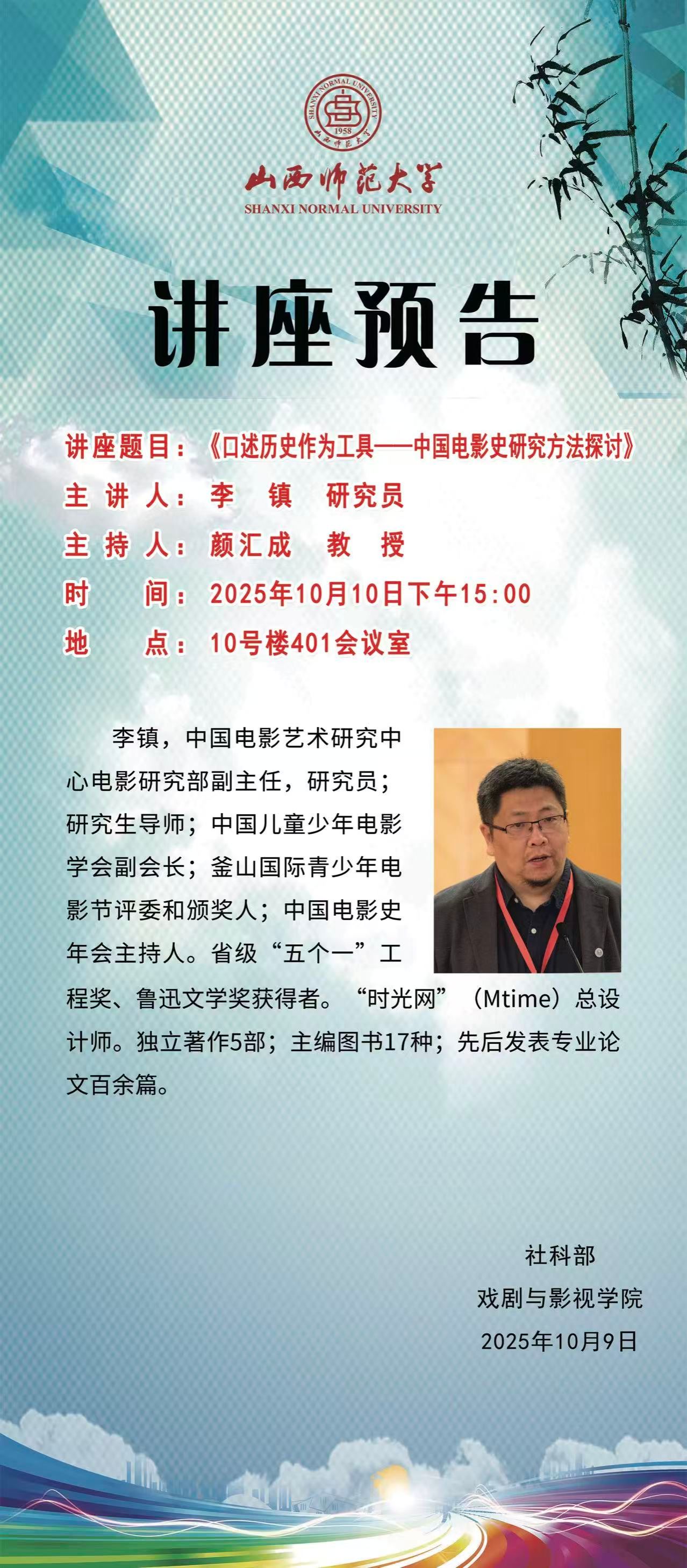 我集团拟于10月10日(周五)下午15:00在南区10号楼401会议室举办《口述历史作为工具——中国电影史研究方法探讨》讲座,主讲人为李镇研究员,本次讲座由颜汇成教授主持。
