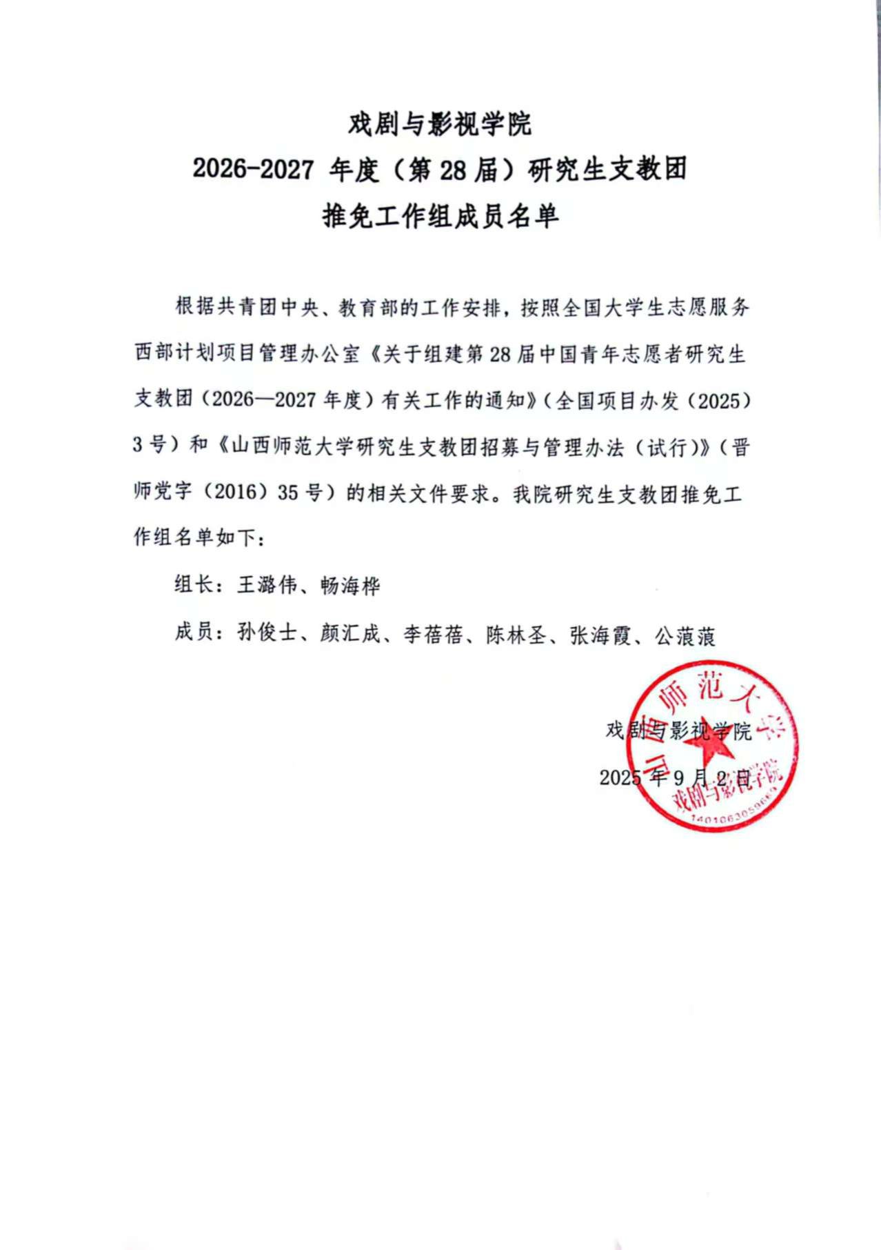 太阳成集团tyc151cc2026-2027年度(第28届)研究生支教团推免工作组成员名单