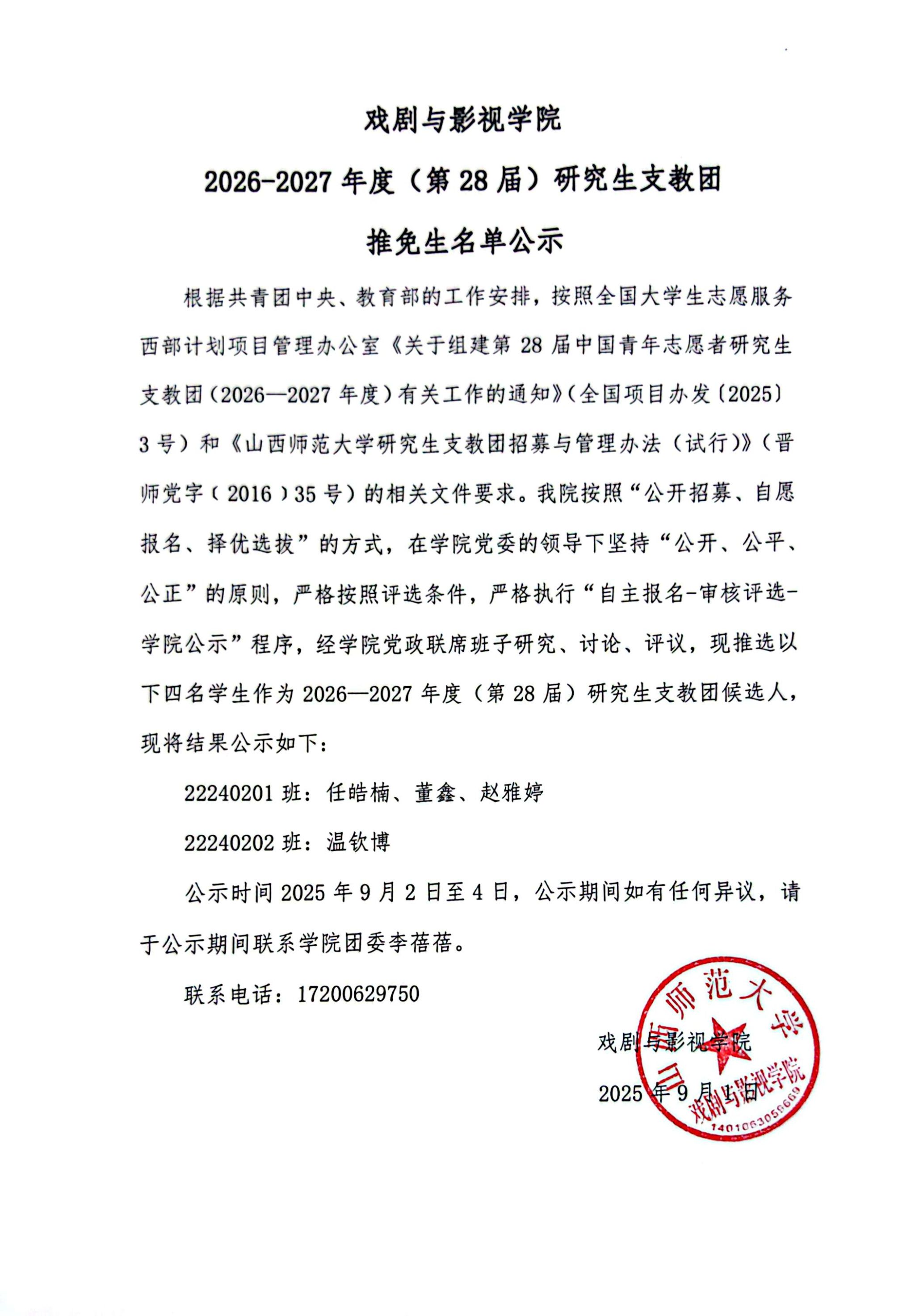 太阳成集团tyc151cc2026-2027年度(第28届)研究生支教团 推免生名单公示