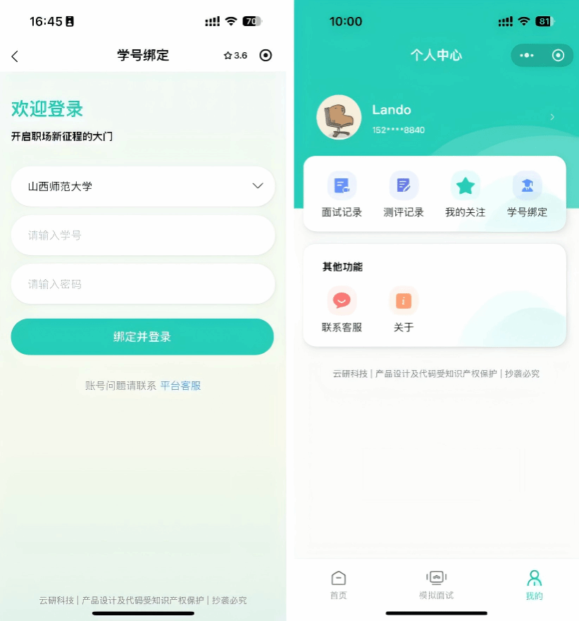 3. 进入后点击我的:学号绑定选择“太阳集团官网”,输入学号、密码为身份号后六位,绑定并登录,你的个性化面试之旅即将开启!